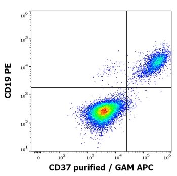 Fig. 1: Flow cytometry multicolor surface staining of human lymphocytes stained using anti-human CD37 (MB-1) purified antibody (concentration in sample 0.2 μg/ml, GAM APC) and anti-human CD19 (LT19) PE antibody (20 μl reagent / 100 μl of peripheral whole blood).