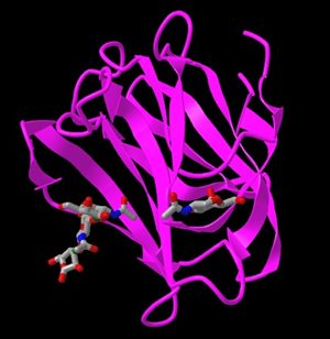 Fig. 3: Crystal structure of human galectin-9 N-terminal CRD in complex with Forssman pentasaccharide. Cited from: www.ncbi.nlm.nih.gov/Structure/mmdb/mmdbsrv.cgi?uid=2eal